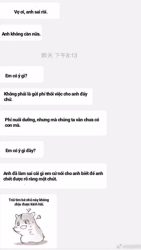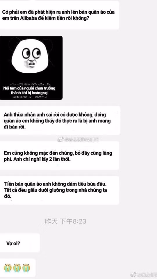 Sau khi tự thú 1 lỗi lầm nho nhỏ thấy vợ vẫn không trả lời, anh chồng đầy tuyệt vọng: "Vẫn không phải à? Có phải em đã phát hiện ra anh lén bán quần áo của em trên Alibaba để kiếm tiền rồi không? Anh thừa nhận anh sai rồi có được không?
