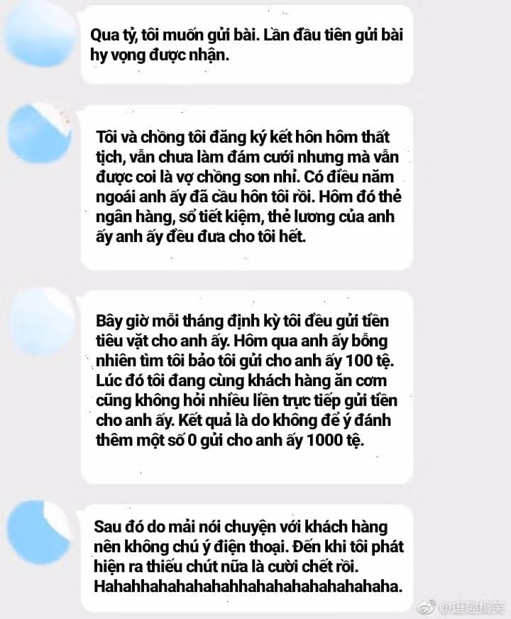 Theo đó, sau khi bỗng nhiên nhận được gấp 10 lần số tiền mình xin, anh chồng này đầy hốt hoảng nhắn tin, gọi điện cho vợ. Tuy nhiên, cô lại không nghe vì đang bận tiếp khách. Nhưng anh chồng nào có hay, vợ càng như thế, anh chồng lại càng sợ hãi, cho rằng cô đang giận mình ghê gớm lắm.