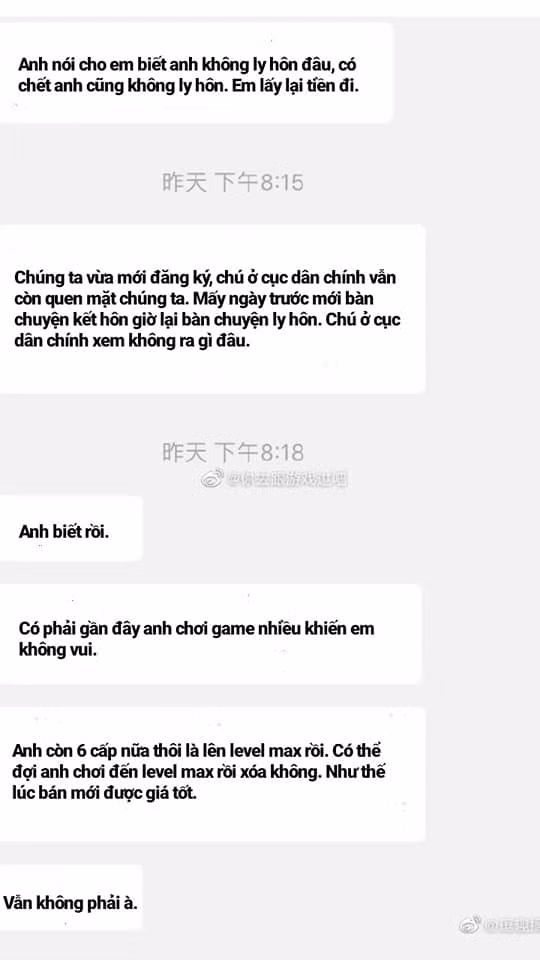 Khuyên nhủ lý lẽ trái phải rằng tại sao không nên ly hôn không tác dụng, anh chồng bắt đầu "khổ nhục kế", chưa đánh đã tự khai ra những lỗi lầm của mình và cầu xin vợ tha thứ: "Anh biết rồi, có phải gần đây anh chơi game nhiều khiến em không vui? Anh còn 6 cấp nữa thôi là lên level max rồi. Có thể đợi anh chơi đến level max rồi xóa không? Như thế lúc bán mới được giá."
