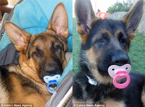 Đa số các chú chó con đều dễ dàng "được thỏa mãn" với các món đồ chơi dành cho chó, nhưng bé German Shepherd này lại là trường hợp đặc biệt. Nó dường như không nhận thức được... mình là chó nên liên tục đòi... ngậm ti giả, ngủ trong xe đẩy và... bú bình.