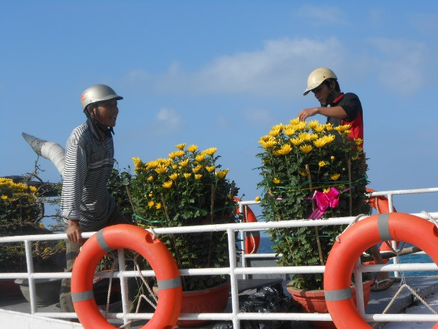 Theo anh Tâm – Cơ quan khí tượng thủy văn dự báo, từ ngày 29/1 trở đi biển sẽ động lại vì ảnh hưởng của không khí lạnh tăng cường, đợt không khí lạnh này sẽ kéo dài cả tuần, do đó để chủ động trong việc vận chuyển gần 200 tấn hàng tết ra đảo theo hợp đồng với các chủ hàng, nên anh cho tàu vào đất liền để chuyển hàng về đảo. Ngoài chở hàng hóa tết, từ nay đến những ngày giáp tết, tàu của anh còn nhận chở hàng ngàn chậu bông tết ra đảo.
