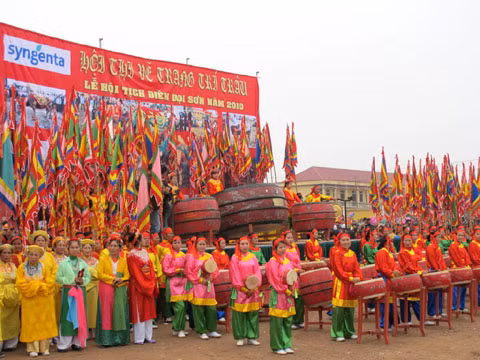Trong tiếng trống dòn dã của Lễ hội Tịch Điền, 9 trâu cày được phủ vải đỏ, mỗi trâu cày có một người đỡ, hai người đỡ chuôi cày và hai cô gái theo để gieo hạt giống.