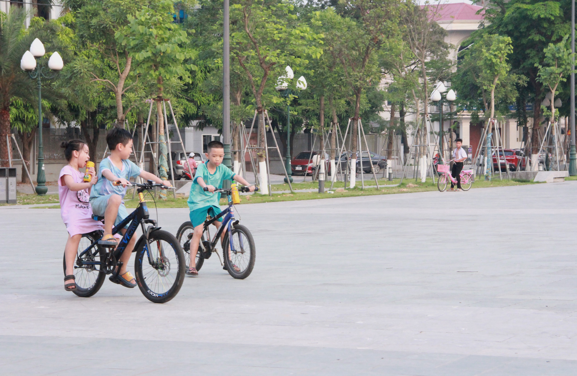 Không chỉ cải tạo, nâng cấp các tuyến phố mà các khu vực công cộng, quảng trường đều được xây dựng để phù hợp với diện mạo mới. (Ảnh các cháu nhỏ vui chơi tại quảng trường Lý Tự Trọng, TP Hà Tĩnh)