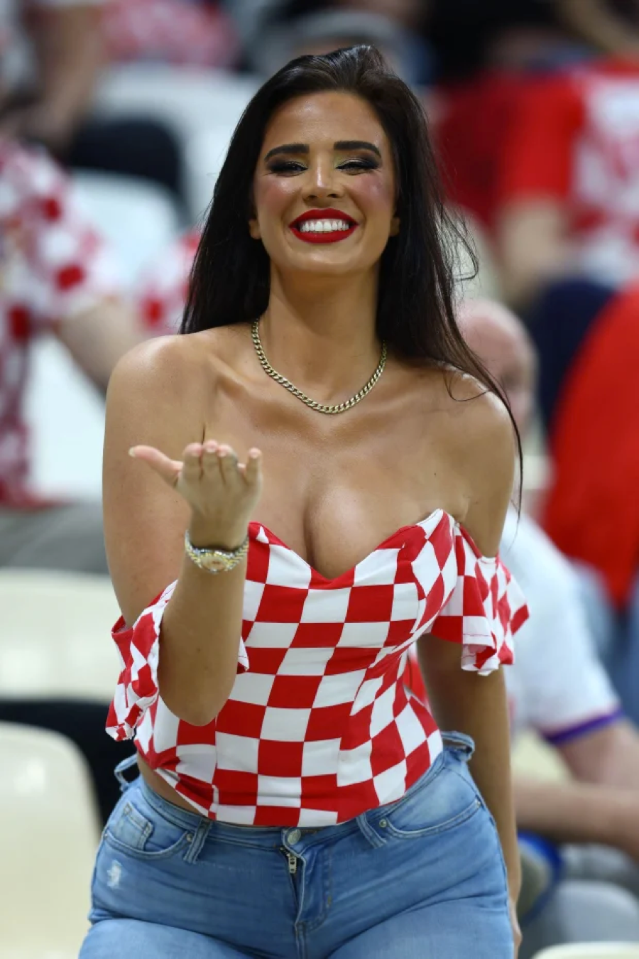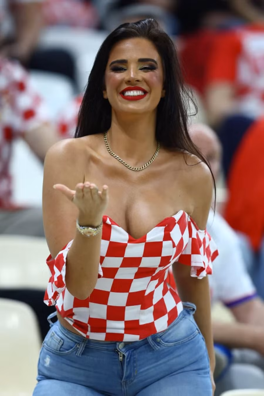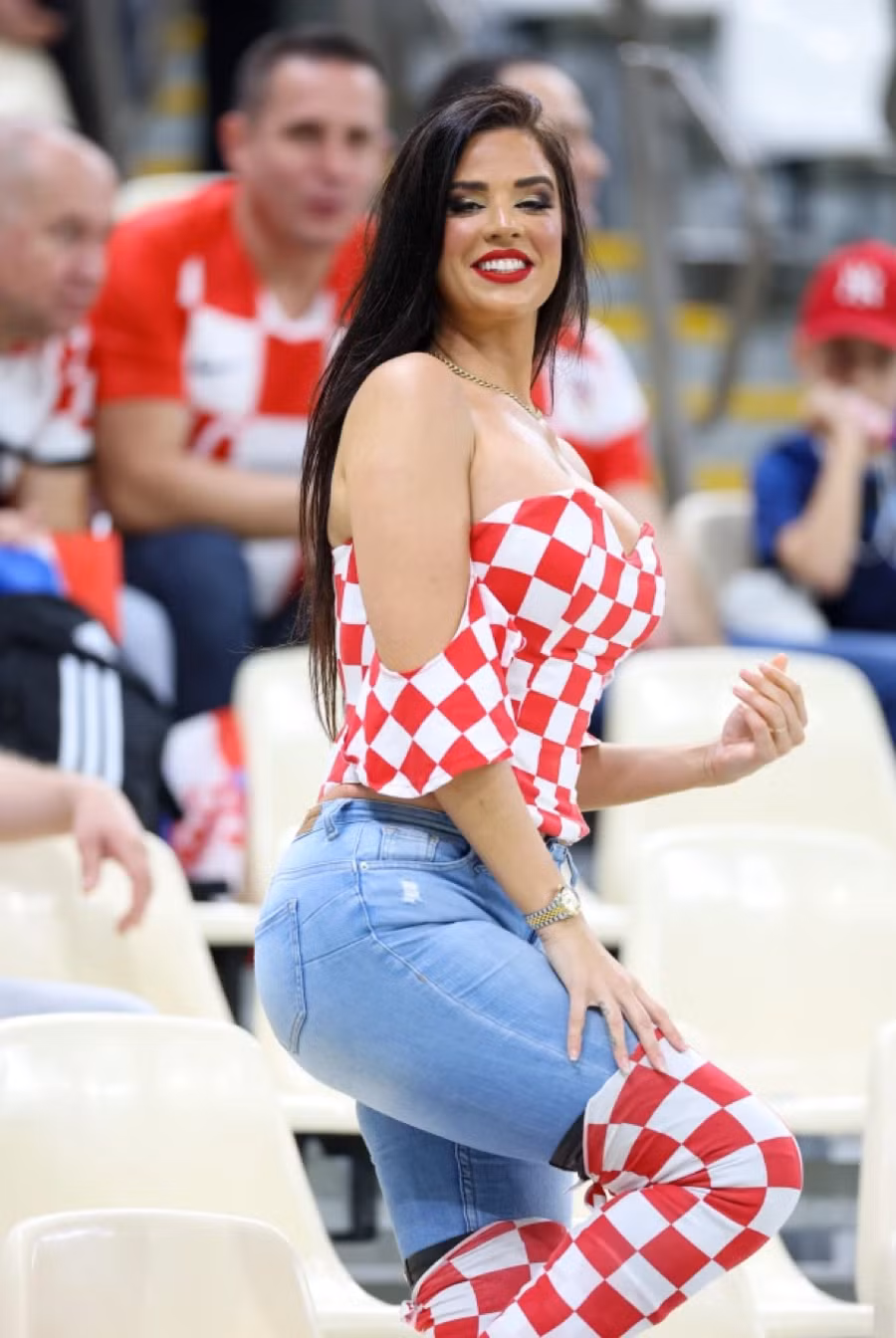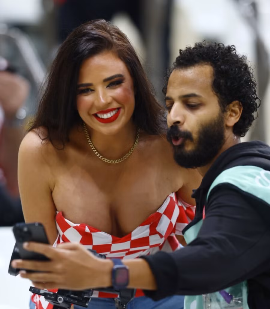 Trong niềm phấn khích, cổ động viên được mệnh danh ‘nóng bỏng nhất’ World Cup 2022 Ivana Knoll đã tạo dáng trong chiếc crop-top sặc sỡ mang màu cờ sắc áo tuyển Croatia, trên khán đài sân Khalifa International.
