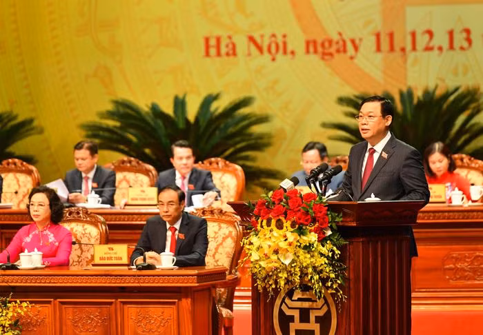 Ủy viên Bộ Chính trị, Bí thư Thành ủy Hà Nội Vương Đình Huệ phát biểu khai mạc Đại hội. Ảnh: VGP/Mai Anh