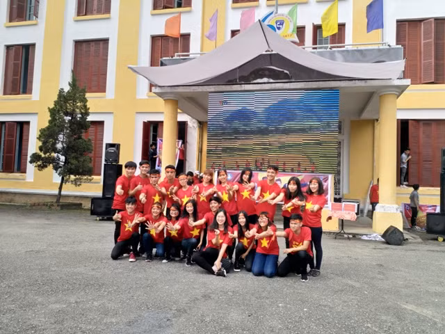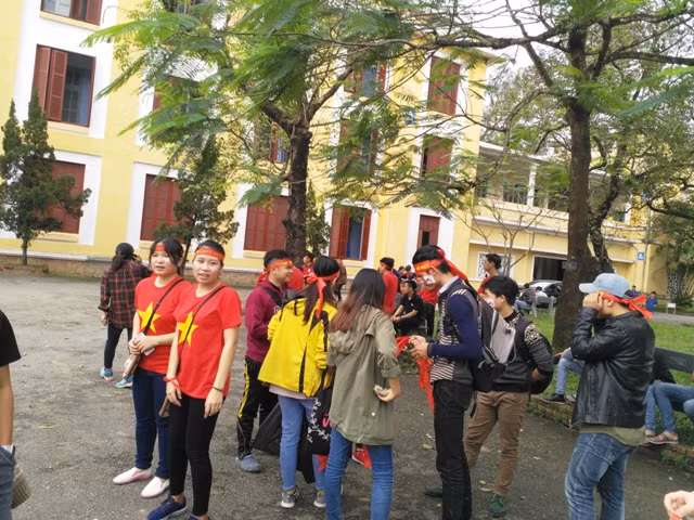 | Sân trường sôi động tiếng động viên, cổ vũ các tuyển thủ U23 Việt Nam thi đấu. Niềm vui vỡ ào cùng bàn thắng của Quang Hải, giúp đội tuyển U23 Việt Nam san bằng tỷ số trận đấu. |