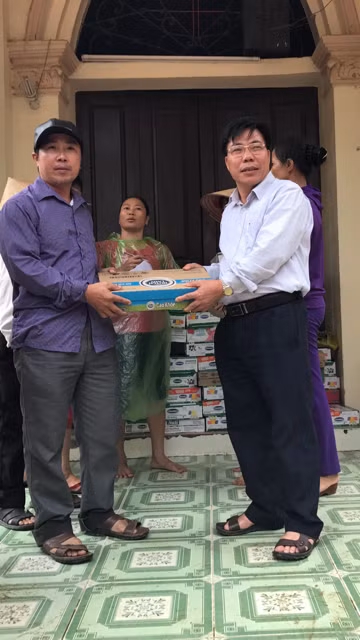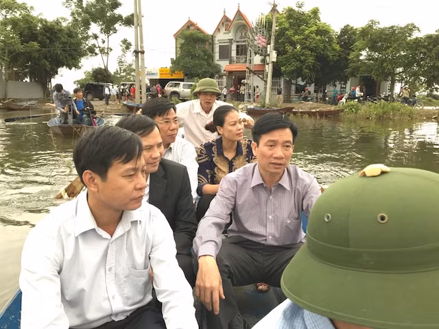 Các đồng chí Lãnh đạo Huyện Ủy, MTTQ, Phòng GD&ĐT huyện thăm hỏi bà con vùng ngập lụt.