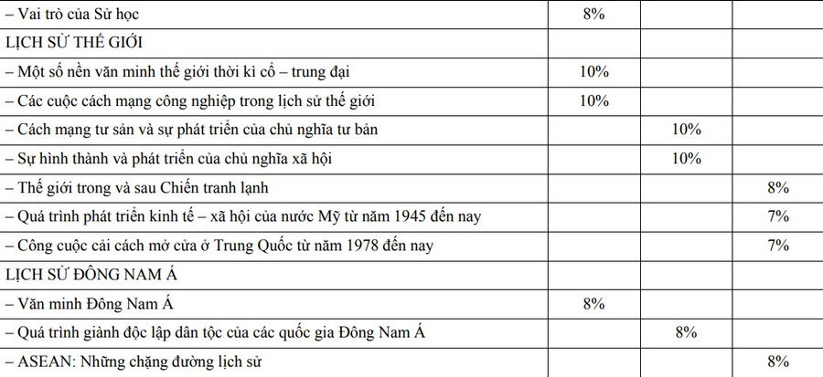 Trục phát triển chính của Chương trình môn Lịch sử là hệ thống các chủ đề và chuyên đề học tập về những vấn đề cơ bản của lịch sử thế giới, lịch sử khu vực Đông Nam Á và lịch sử Việt Nam, nhằm nâng cao và mở rộng kiến thức thông sử mà học sinh đã được học ở cấp THCS.