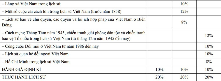 Chương trình môn Lịch sử coi trọng nội dung thực hành lịch sử, kết nối lịch sử với thực tiễn cuộc sống. Cụ thể, Chương trình coi thực hành là một nội dung quan trọng và là công cụ thiết thực, hiệu quả để phát triển năng lực học sinh; tăng cường thời lượng thực hành; đa dạng hoá các loại hình thực hành thông qua các hình thức tổ chức giáo dục như hoạt động nhóm, cá nhân tự học; học ở trên lớp, bảo tàng, thực địa; học qua dự án, di sản;...;