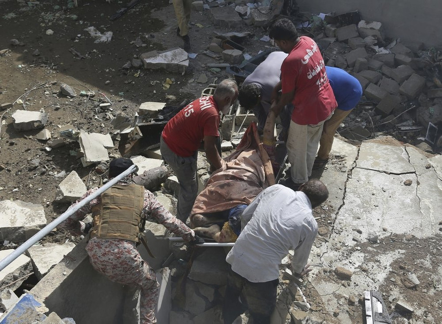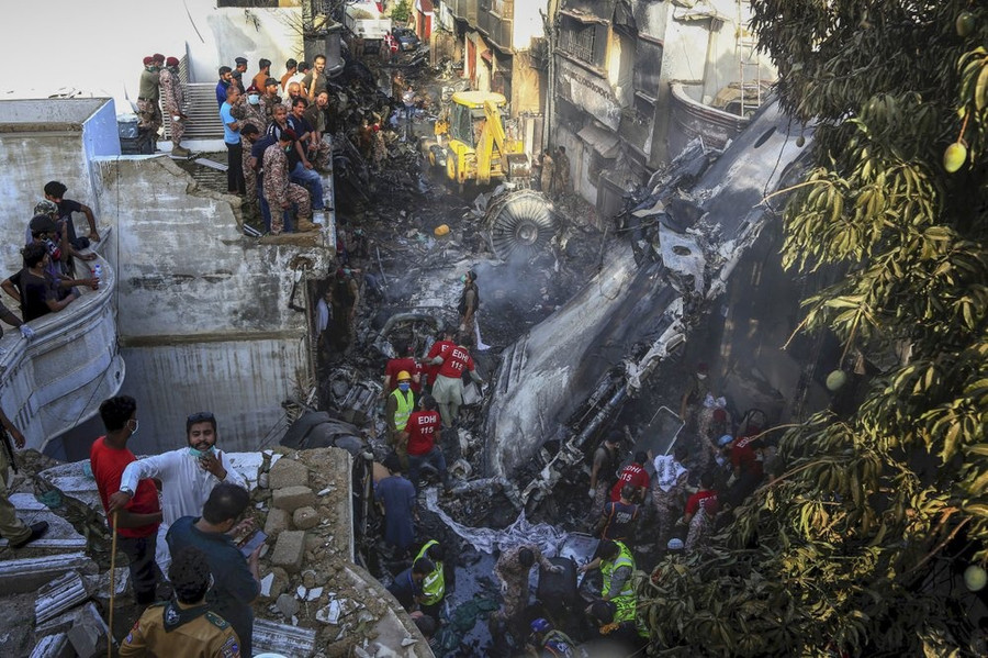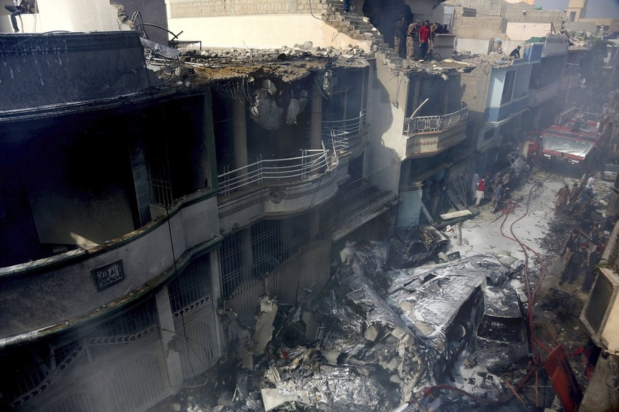 |   Máy bay dân dụng số hiệu 8303 của hãng hàng không Pakistan International chở 98 người đã gặp nạn và lao xuống một khu dân cư gần sân bay Jinnah ở thành phố cảng Karachi của Pakistan hôm 22/5. Nhà chức trách Pakistan cho biết 2 người có mặt trên máy bay vẫn còn sống. Ít nhất 88 thi thể đã được tìm thấy trong đống đổ nát. Hiện không rõ bao nhiêu người trên mặt đất thương vong trong vụ việc. Ảnh: AP.  |