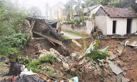 Không chỉ gia đình anh Bắc, gia đình bà Nguyễn Thị Sợi cũng bị thiệt hại khá nặng nề, toàn bộ khu công trình phụ khoảng 55m2 cũng bị sụp đổ hoàn toàn. Gần đó, nhà ông Vũ Văn Học, công trình phụ khoảng 30m2 cũng bị nuốt chửng, tường nhà nứt khá lớn kéo dài chừng 3m.