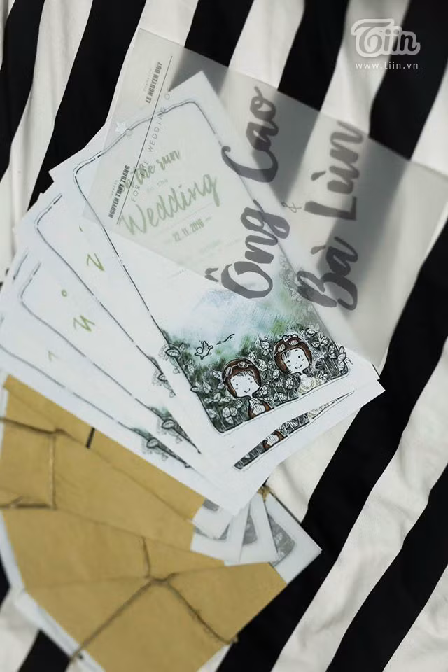 Không chỉ bộ ảnh cưới, thiệp cưới của cặp đôi cũng do chú rể tự nhận đã "cần mẫn", "vật vờ mấy ngày liền để hoàn thiện tặng bà xã.