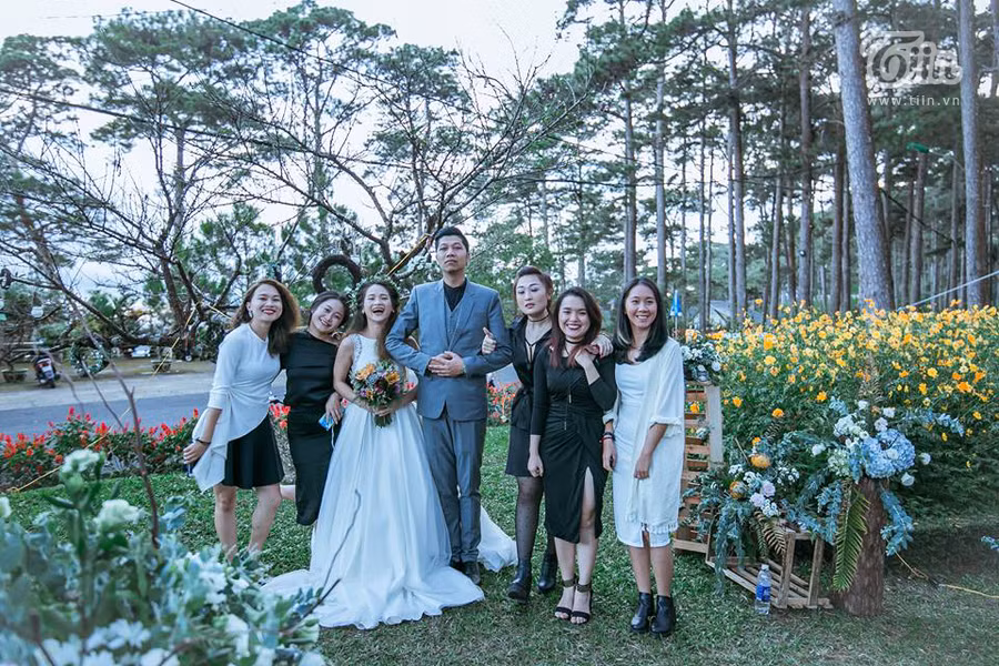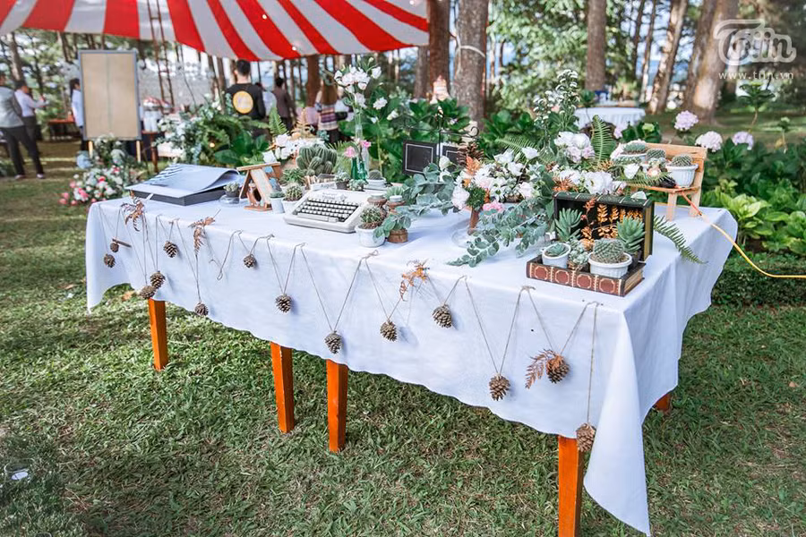 Ngoài ra, toàn bộ tiệc cưới dành cho bạn bè do cặp đôi lên ý tưởng và thực hiện. Yêu thích cây cỏ, hoa lá, cặp đôi cùng bạn bè đã lượm hoa, cỏ, thông trên đồi và cô dâu dành thời gian tự tay trang trí bàn tiệc cho các vị khách.