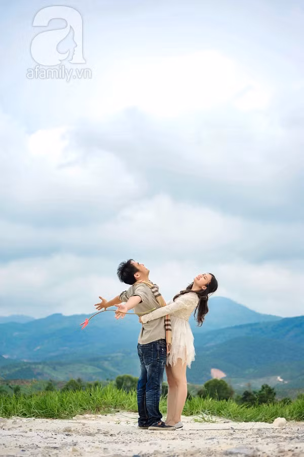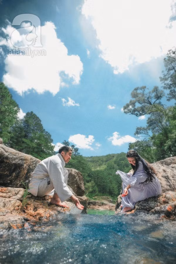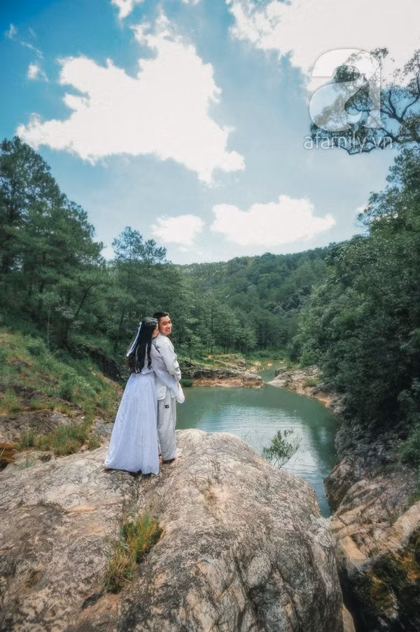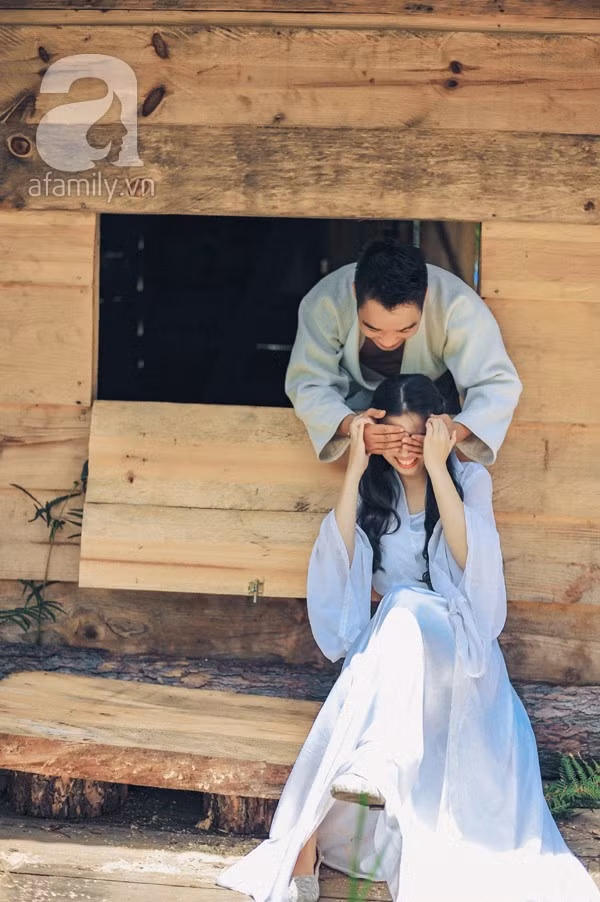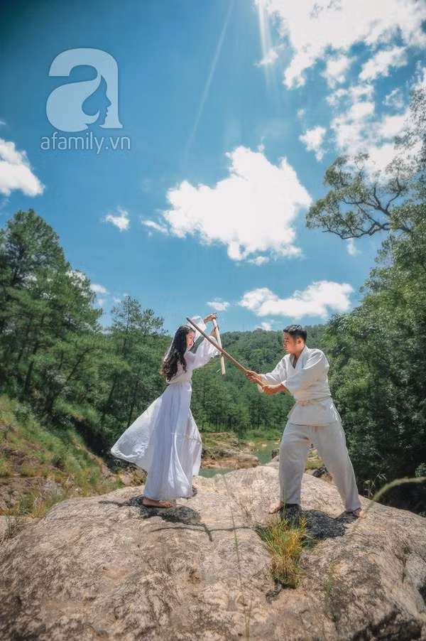 “Chàng rất thích kiếm thuật, và có tiếng sáo lay động. Mình không muốn bộ ảnh cưới chỉ là vùng trời của riêng cô dâu, và chú rể chỉ đóng vai trò làm nền. Vì vậy, mình chọn cách thức thể hiện được con người chàng trọn vẹn và đẹp đẽ nhất: chụp ảnh theo phong cách kiếm hiệp. Bọn mình muốn kể một câu chuyện tình yêu hoang sơ, thuần khiết. Dĩ nhiên, tất cả chỉ là tưởng tượng của hai đứa. Nhưng đồng nhất cả trong trí tưởng tượng của nhau cũng là chuyện đáng nói chứ. Không chừng, cái tụi mình gọi là kịch bản tưởng tượng, hóa ra là ký ức từ kiếp nào của tụi mình thì sao?”, cặp đôi cùng tuổi không giấu nụ cười thú vị khi nhắc về thành quả.