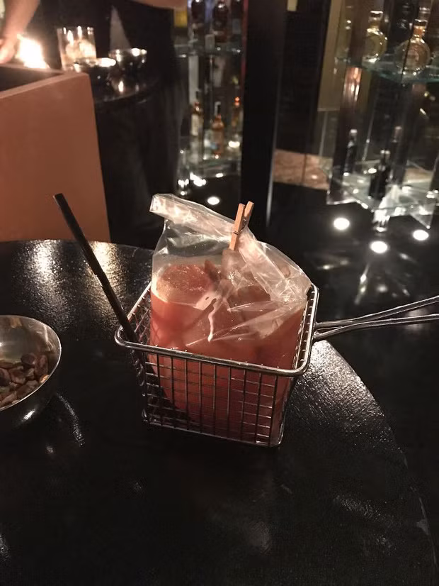 Bạn trai của người phụ nữ chụp tấm ảnh này được phục vụ ly cocktail Bloody Mary trong một cái giỏ chuyên dùng để chiên đồ.