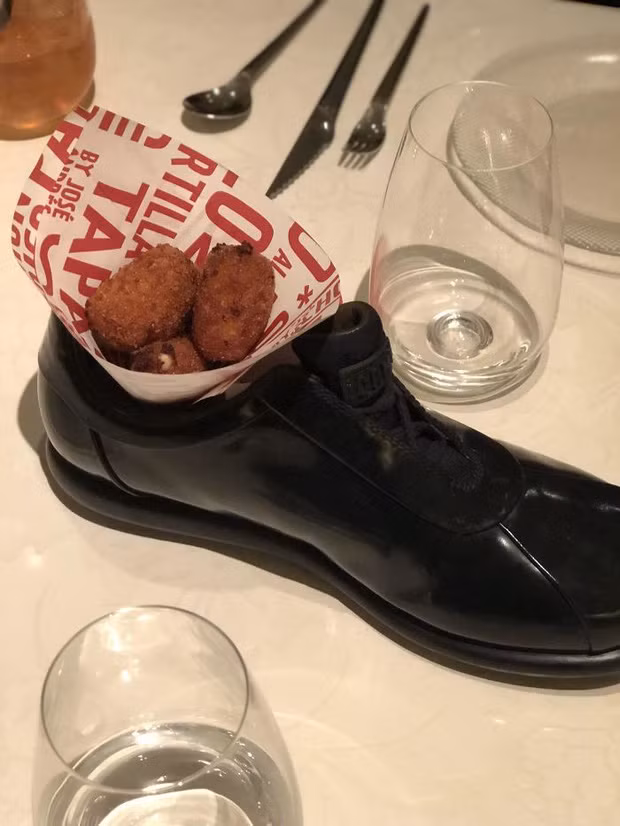 Khai vị "sương sương" đặt trong chiếc giày, vị khách đã ngỏ lời muốn được đi thử giày hoặc mang luôn về nhà nhưng đã bị nhà hàng từ chối.