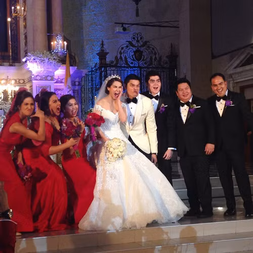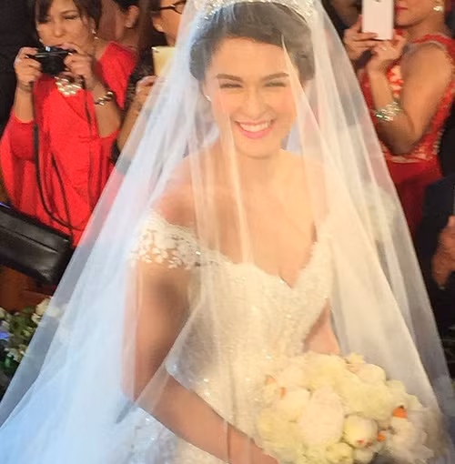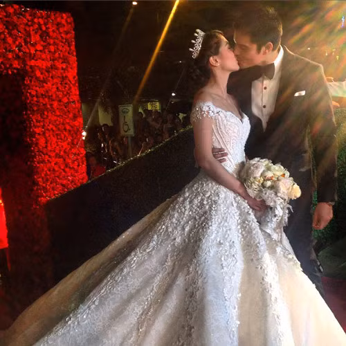 Đám cưới của Marian Rivera và Dingdong Dantes không chỉ có sự góp mặt của các ngôi sao giải trí hàng đầu Philippines mà còn có sự xuất hiện của tổng thống nước này. Trong lễ cưới, cô dâu xuất hiện rạng ngời trong chiếc váy cưới trắng cổ V của NTK Michael Cinco và đội vương miện xinh như công chúa.