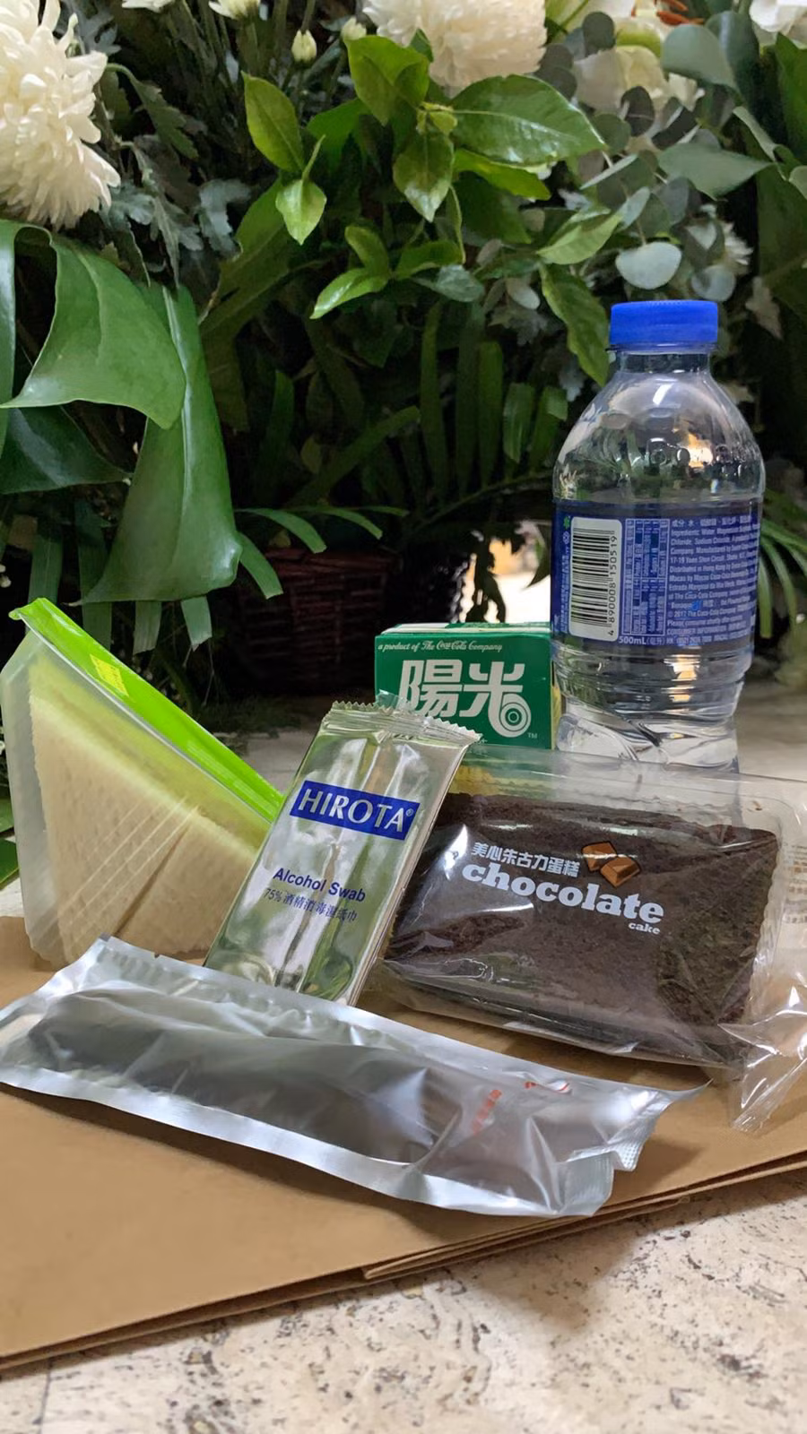 Bên trong bao gồm nước suối, sandwich, bánh ngọt, nước trái cây đóng hộp, khăn giấy và muỗng đũa nhựa.