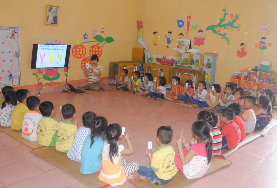 Cô Trần Thị Hồng Thái trong giờ hướng dẫn học sinh làm quen với chữ cái