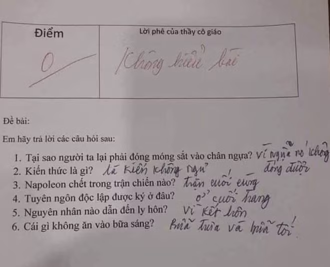 Khi được hỏi "kiến thức là gì?", học sinh này lém lỉnh đáp "là kiến không ngủ". Rồi "Napoleon chết trong trận chiến nào?" thì cô (cậu) học trò này tương nay câu "trận cuối cùng", thế thì thầy cô cũng cạn lời rồi.