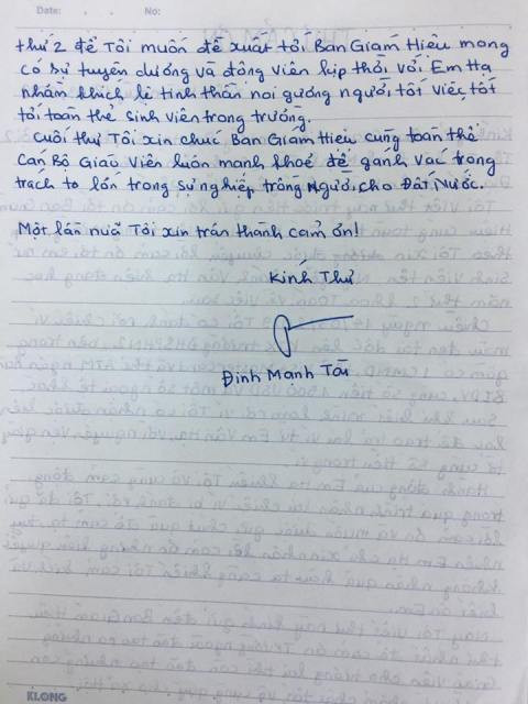 | Lá thư của anh Tài gửi đến nhà trường |