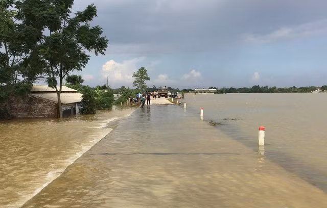 Sự cố vỡ đê sông Bùi 2 (thuộc xã Hoàng Văn Thụ và xã Tân Tiến, huyện Chương Mỹ, Hà Nội) xảy ra vào sáng 12/10 khiến đoạn đường liên xã ngập sâu.