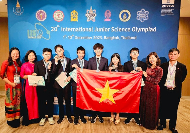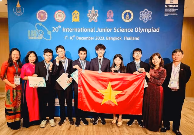 Hoàng Phạm Minh Khánh, lớp 10G0 Trường Newton (giữa) cùng đội tuyển và thầy cô lãnh đội tại kỳ thi Olympic Khoa học trẻ IJSO 2023.