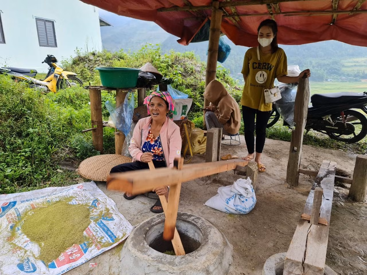 | Lúa gặt về được người dân đem ra tuốt và sau khi lọc hết hạt lép thóc được cho vào bao tải mang đi rang trong ngày. |