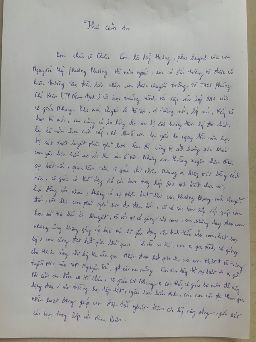 Trong thư tay chị Mỹ Hương cho biết, do điều kiện công việc, hè năm 2022 gia đình chị chuyển từ tỉnh Nam Định về Hà Nội. Con gái chị được Ban Giám hiệu trường THCS Nguyễn Trãi tiếp nhận vào lớp 9A1.