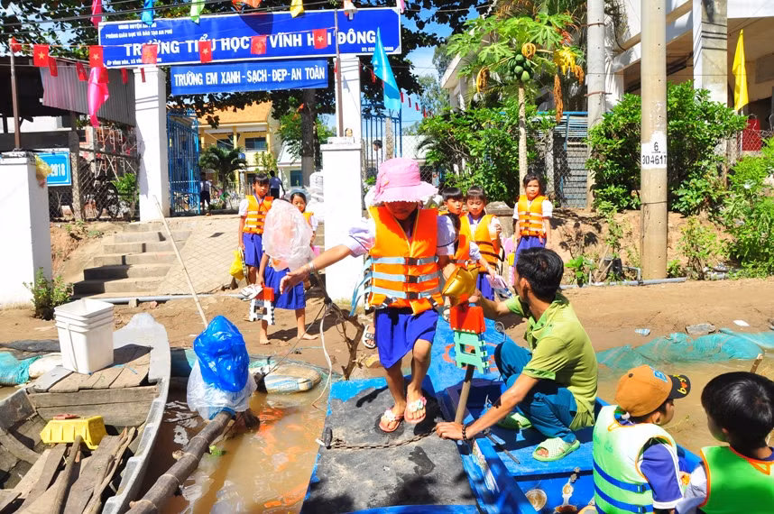 Nhiều tuyến giao thông bị ngập sâu nên học sinh không thể đi bộ, đi xe đến trường. Chính vì thế, phụ huynh và chính quyền địa phương phải dùng xuồng máy đưa các em đến trường để tìm con chữ.