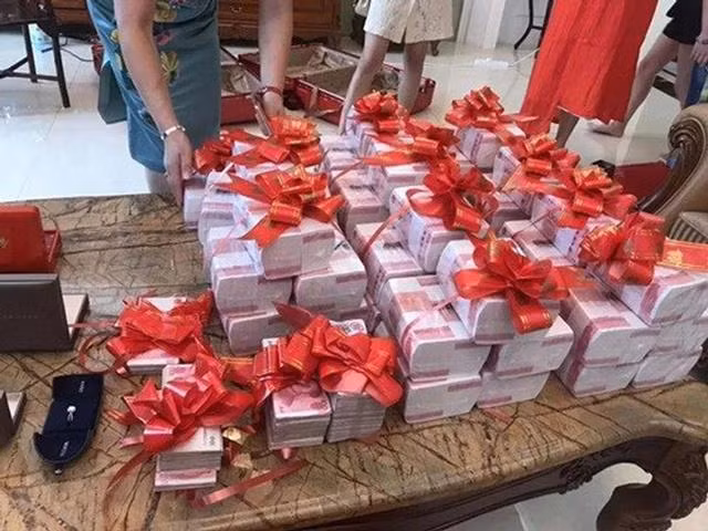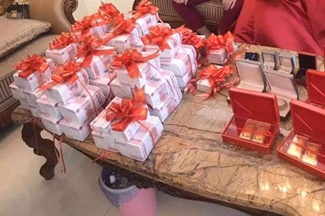 Trong ngày cưới của con gái, bố mẹ của cô đã chuẩn bị của hồi môn "khủng" với vài chục sấp tiền mặt, vàng miếng, trang sức đắt tiền... Tổng giá trị của tất cả lễ hồi môn này lên tới 5,28 triệu nhân dân tệ (gần 18 tỷ đồng).