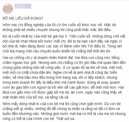 Câu chuyện đầy chân thật ở trên đã chạm tới đáy sâu cảm xúc của hàng nghìn bậc cha mẹ. Không ít cặp vợ chồng trẻ thảng thốt nhận ra mình trong những dòng nhật ký của bé gái lớp 5, bởi cuộc sống bây giờ có ai mà không bận rộn, vật lộn với cơm áo gạo tiền mỗi ngày cơ chứ. Mở mắt ra là bị cuốn vào nhịp sống xô bồ, với công việc, các mối quan hệ, sự nghiệp tương lai, và đủ mọi vấn đề "người lớn" khác khiến cho những ông bố bà mẹ buộc phải đẩy con mình vào 2 chữ "tự lập" quá sớm. Chúng phải tự học cách chăm sóc bản thân, giữ an toàn cho chính mình, tự xoay sở trong thế giới của riêng mình trong khi đáng lẽ ra ở lứa tuổi ngây thơ như thế, chúng cần nhất là bố mẹ ở bên.