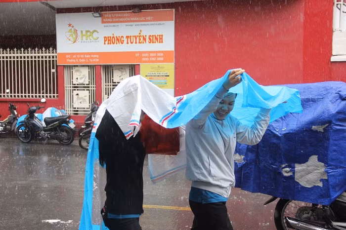 Mặc dù trời đổ mưa trong và sau khi kết thúc môn nhưng các thí sinh, phụ huynh đều vui vẻ và đùa vui "mưa giải nhiệt".