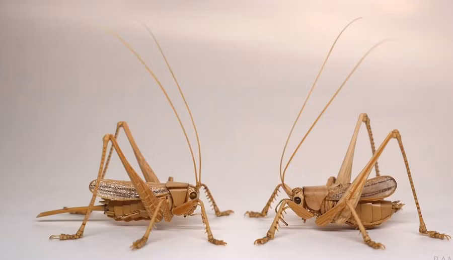 Từ những sợi râu dẻo dai của loài châu chấu đến các đôi cánh có vân của chuồn chuồn và ve sầu, sự chăm chút đến từng chi tiết qua chất liệu bằng tre của Noriyuki Saitoh được xem là một kỳ công ngoạn mục.