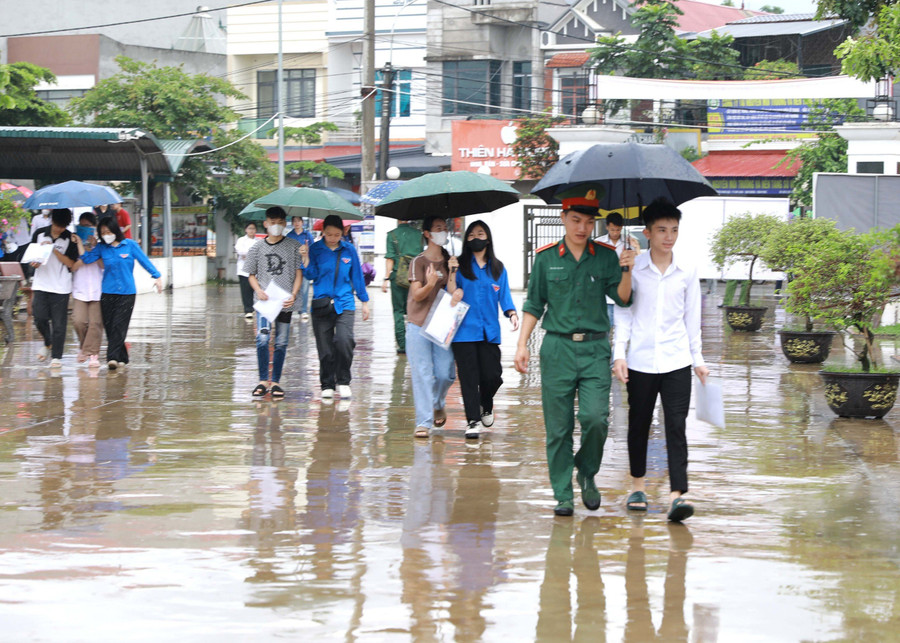 | Dù mưa hay nắng, các chiến sĩ công an, bộ đội vẫn miệt mài làm nhiệm vụ, đảm bảo an toàn cho kỳ thi. Ảnh trước điểm thi Trường THPT Trần Hưng Đạo (Vĩnh Phúc). |