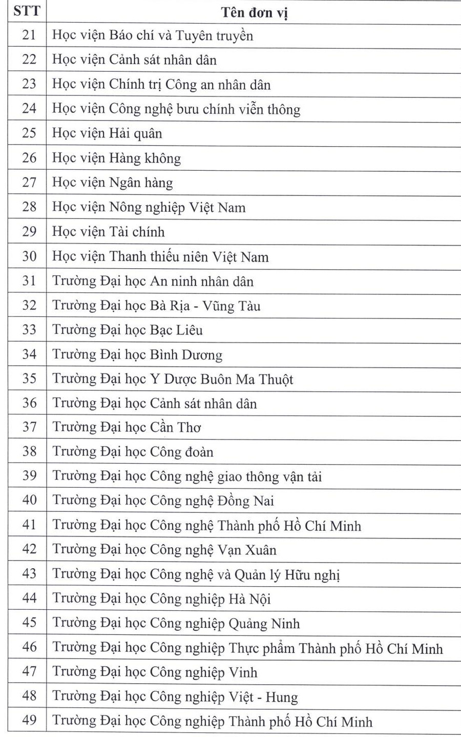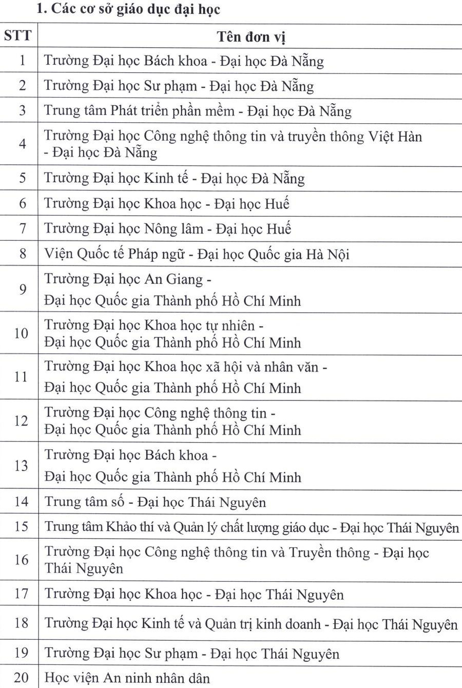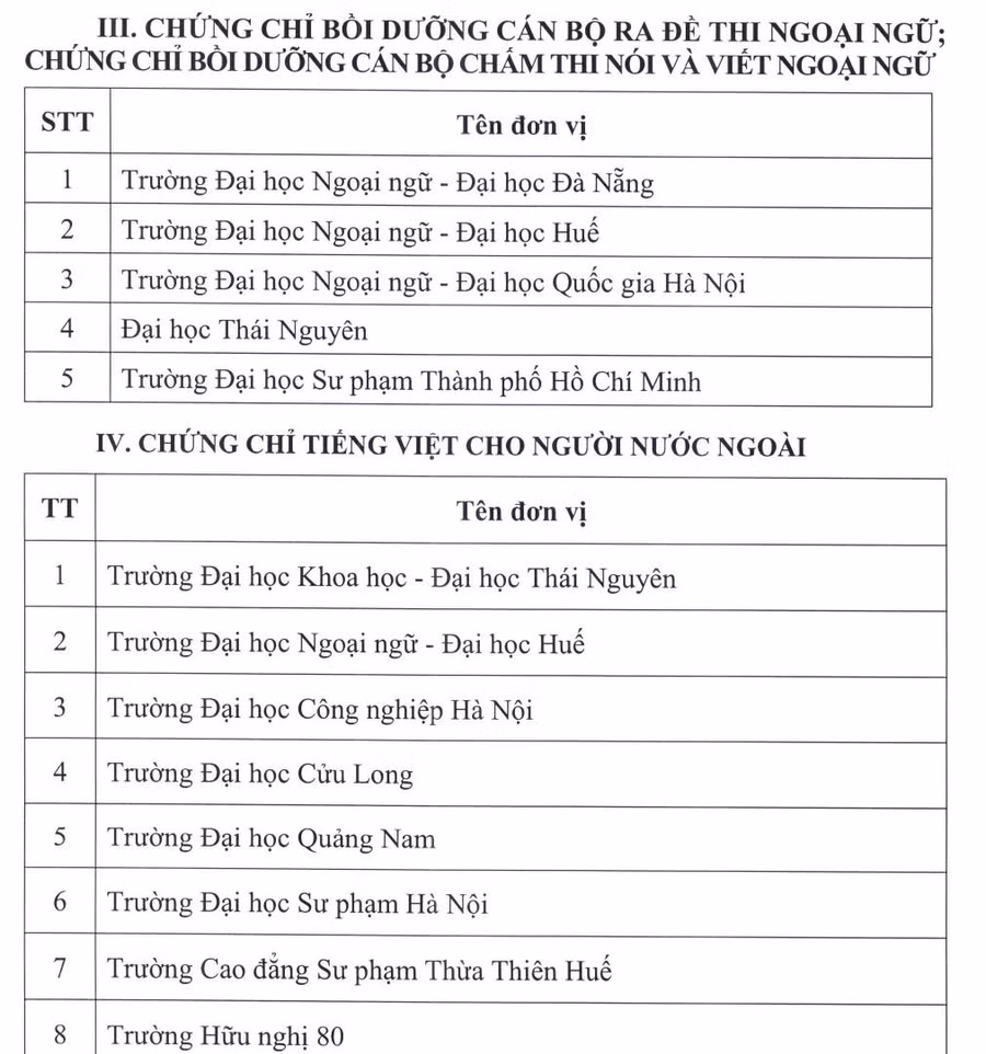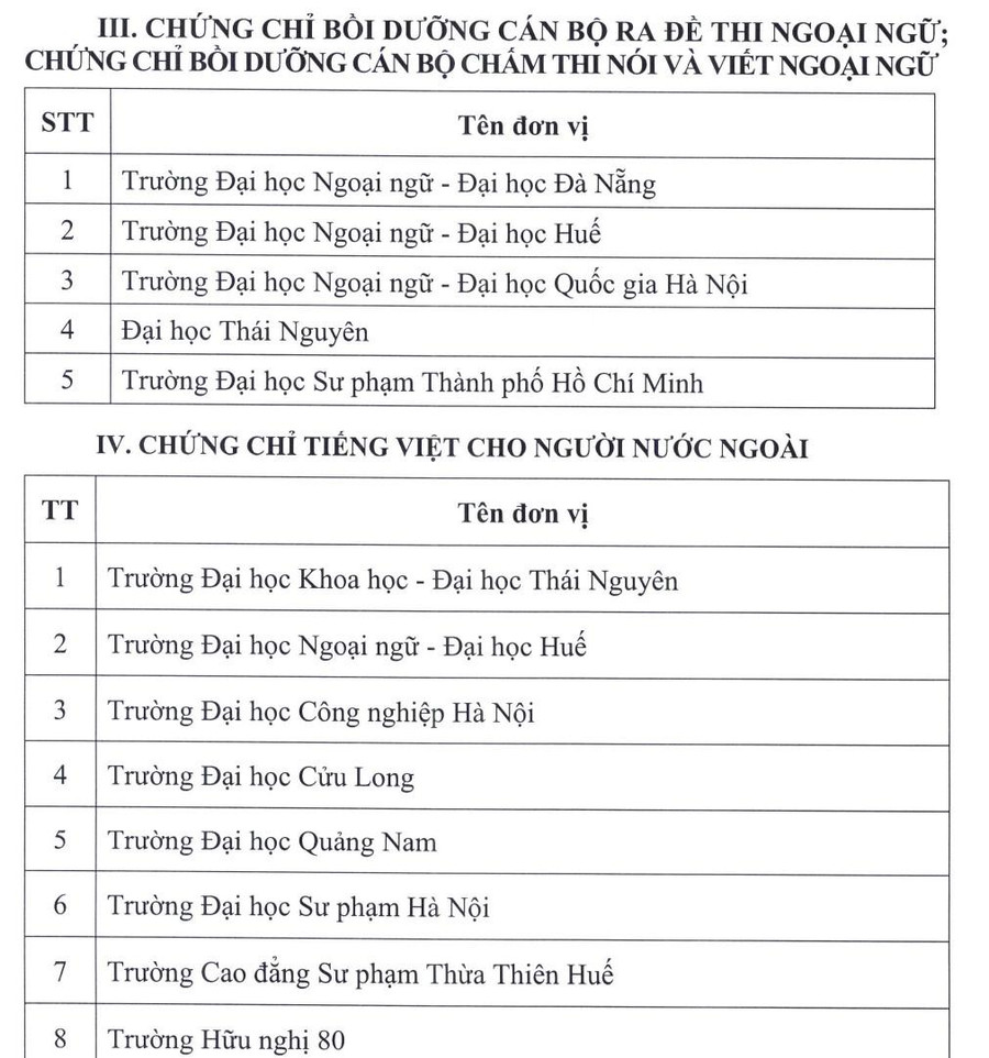 Danh sách đơn vị được tổ chức thi, cấp chứng chỉ bồi dưỡng cán bộ ra đề thi ngoại ngữ; chứng chỉ bồi dưỡng cán bộ chấm thi nói và viết ngoại ngữ; chứng chỉ tiếng Việt cho người nước ngoài như sau: