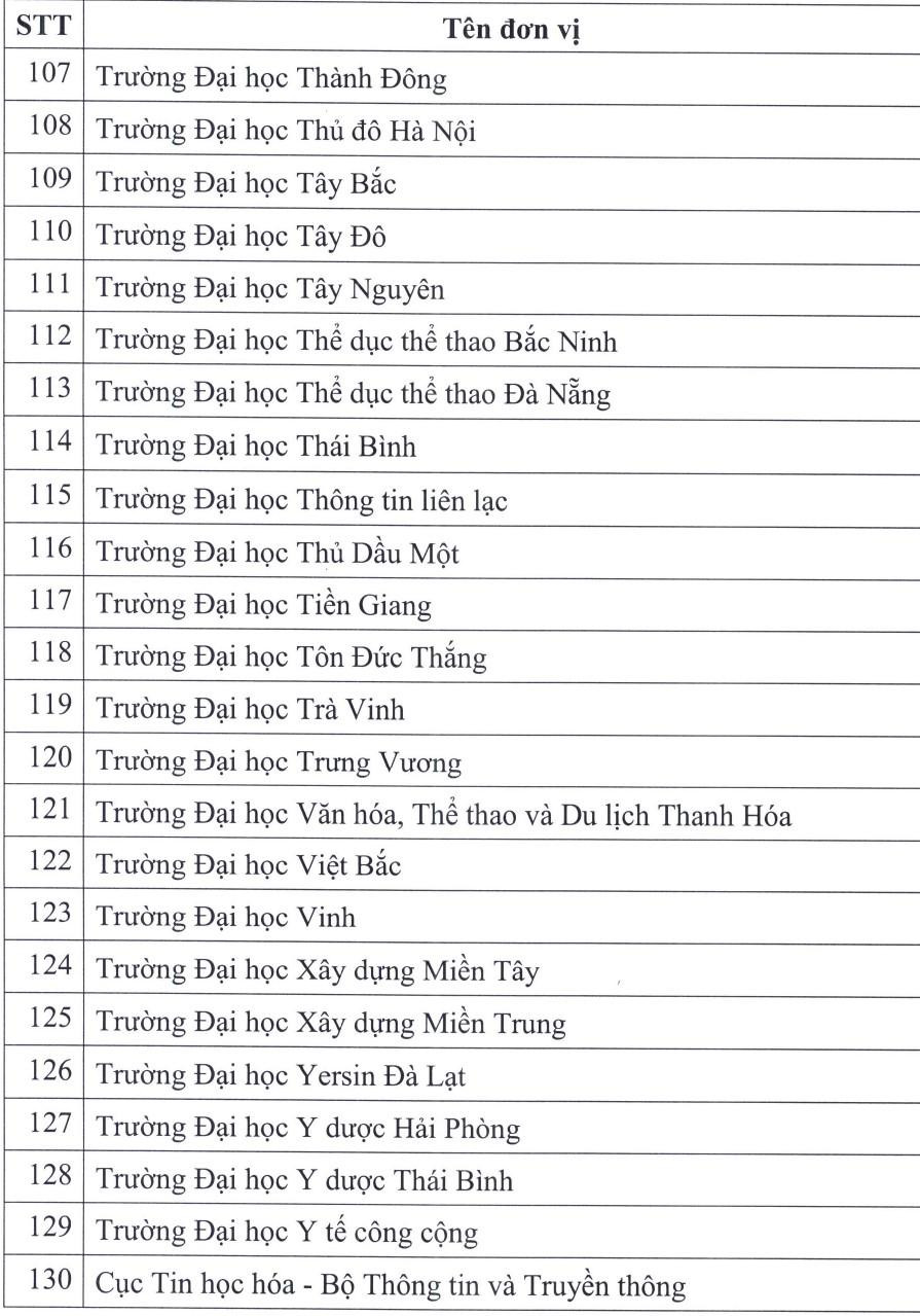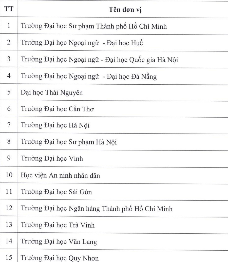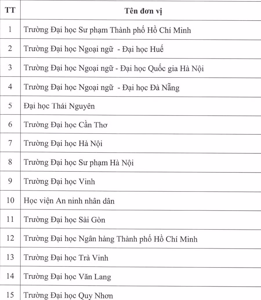 Cụ thể, danh sách đơn vị được tổ chức thi, cấp chứng chỉ ngoại ngữ theo khung năng lực ngoại ngữ 6 bậc dùng cho Việt Nam (tiếng Anh) như sau: