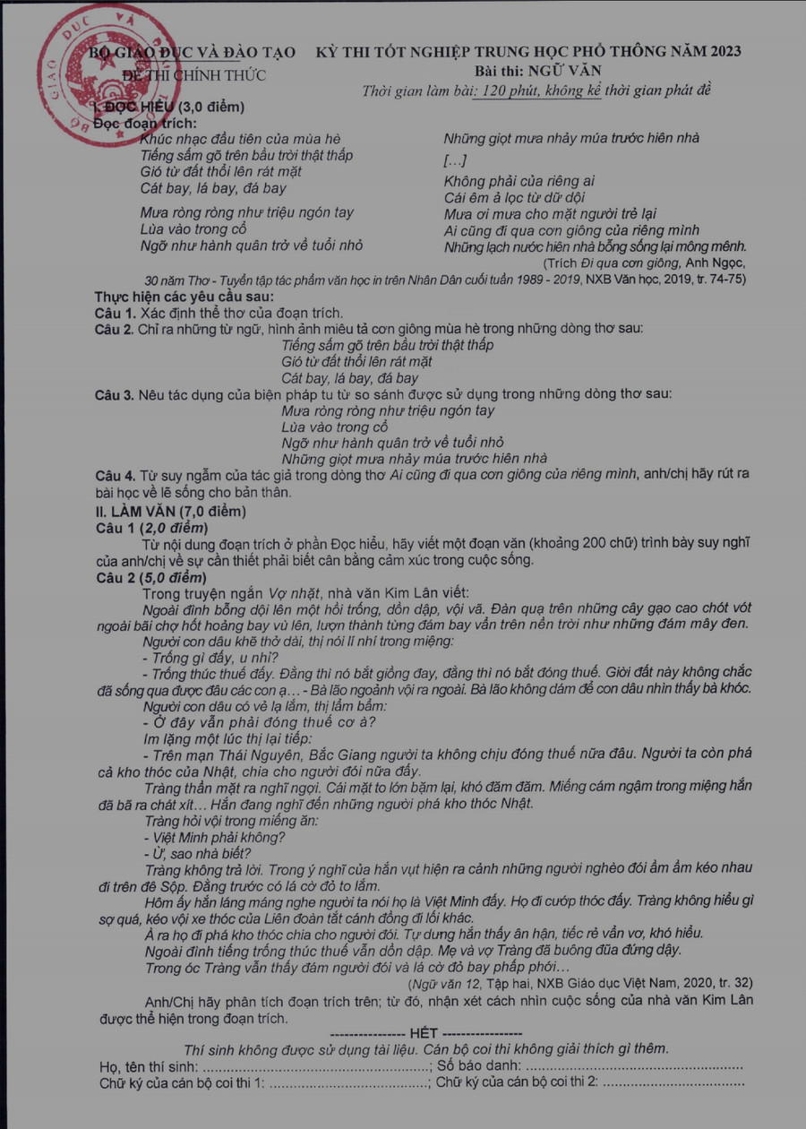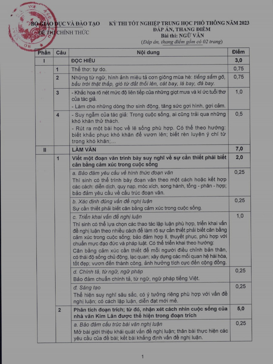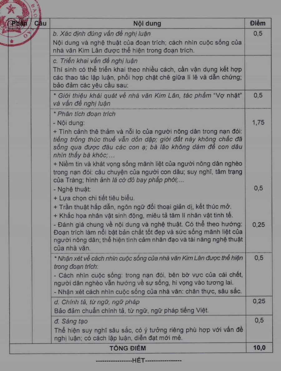 Đáp án, thang điểm bài thi Ngữ văn như sau: