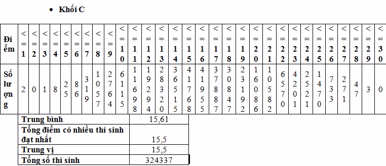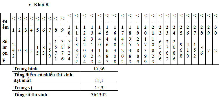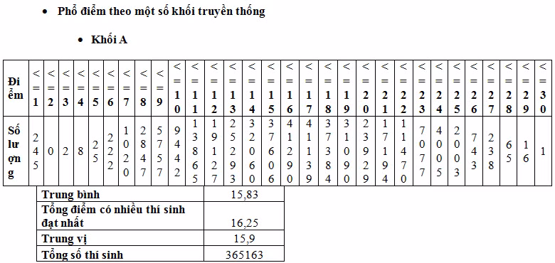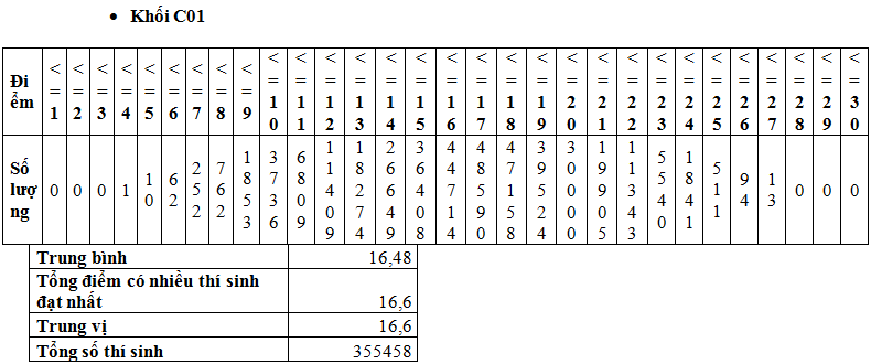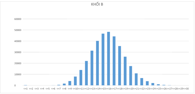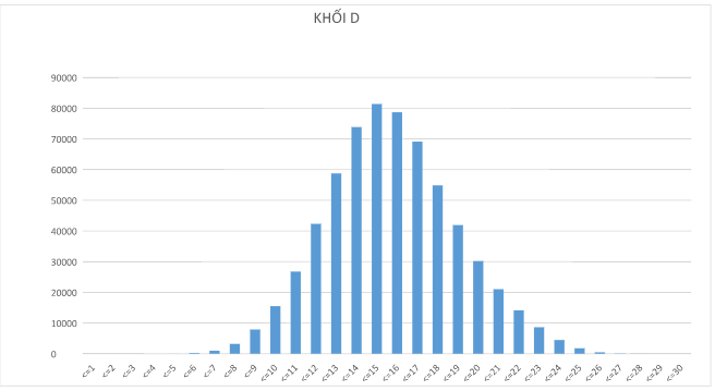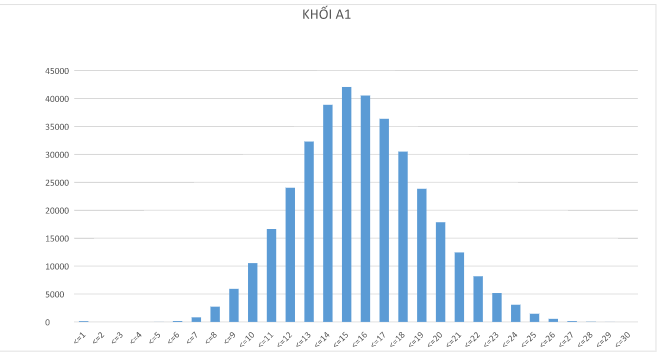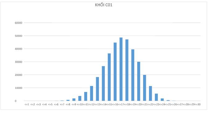 Đối với một số khối thi (A, A1, B, C, C01, D): Tổng điểm của các khối thi đều có phân phối tiệm cận gần tới phân phối chuẩn, điểm trung bình và trung vị của các khối thi gần như nhau.