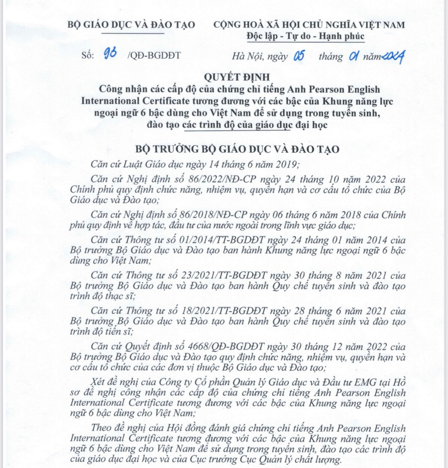Theo đó, ngày 5/1/2024, Bộ GD&ĐT đã ban hành Quyết định số 93/QĐ-BGDĐT công nhận các cấp độ của chứng chỉ tiếng Anh Pearson English International Certificate (PEIC) tương đương với các bậc của Khung năng lực ngoại ngữ 6 bậc dùng cho Việt Nam (KNLNNVN).