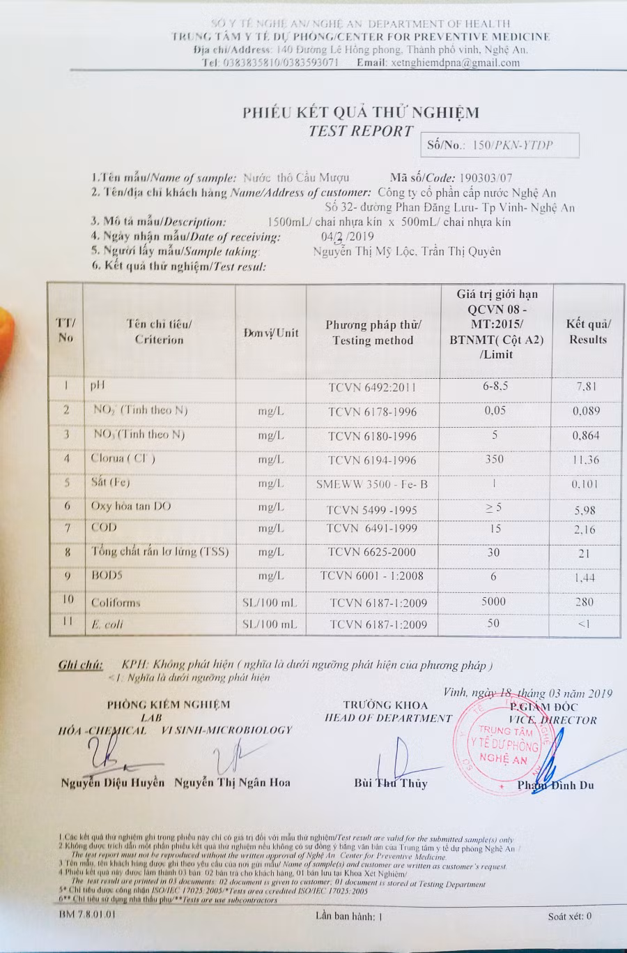 - Phiếu kết quả thử nghiệm mẫu nước thô sông Đào của trung tâm Y tế dự phòng Nghệ An