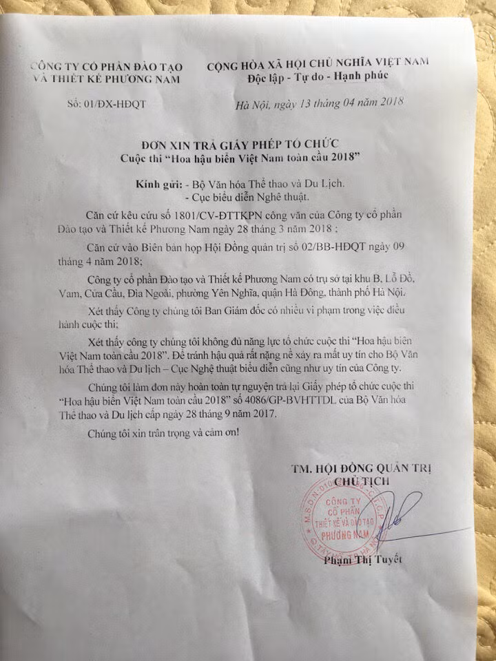“Đồng thời trong buổi làm việc này, tôi và các cổ đông của công ty tôi tha thiết đề nghị trả lại giấy phép tổ chức cuộc thi Hoa hậu biển Việt Nam toàn cầu 2018 được Bộ VH-TT&DL cấp cho công ty Phương Nam để tổ chức”, bà Tuyết nói.
