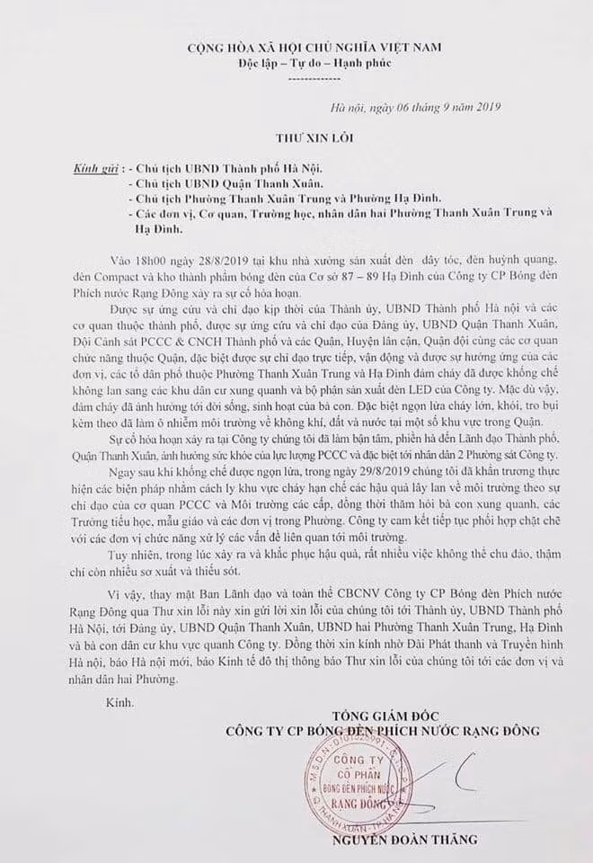Trong thư xin lỗi, ông Nguyễn Đoàn Thăng, Tổng Giám đốc Công ty cổ phần Bóng đèn phích nước Rạng Đông, nhìn nhận: Đám cháy đã ảnh hưởng tới đời sống, sinh hoạt của người dân. Đặc biệt, ngọn lửa cháy lớn, khói, tro bụi kèm theo đã làm ô nhiễm môi trường tại một số khu vực trong quận.