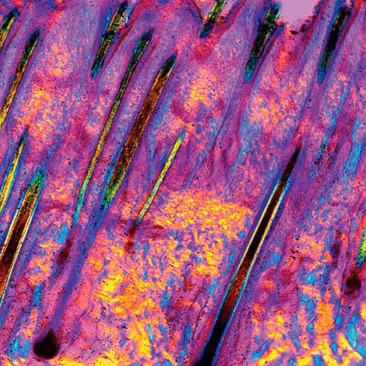 Còn đây là lớp biểu bì gồm các tế bào chết không ngừng được đẩy lên. Phần màu đen chính là nang lông và màu vàng là keratin - loại protein khiến cho da đàn hồi và không thấm nước. (Ảnh: Internet)