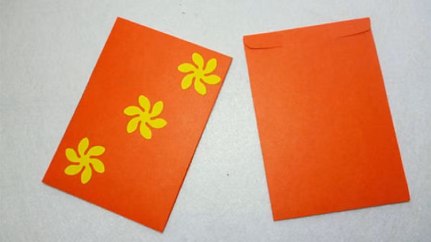 Sau đó, phụ huynh có thể cùng con cắt hình bông hoa nhỏ để dán vào mặt trước phong bao lì xì. Chỉ với những bước đơn giản này, cha mẹ và con hoàn toàn có thể làm nhiều phong bao với màu sắc và kiểu dáng khác nhau.