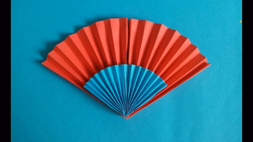 Cắt hai dải ruy băng vàng và dán vào cả hoặc phần cuối của tờ giấy đỏ. Bắt đầu từ cuối một cạnh, lần lượt gấp tờ giấy lên xuống. Sau đó, hãy giữ nếp gấp, gấp đôi quạt. Dán phần chính giữa với nhau.