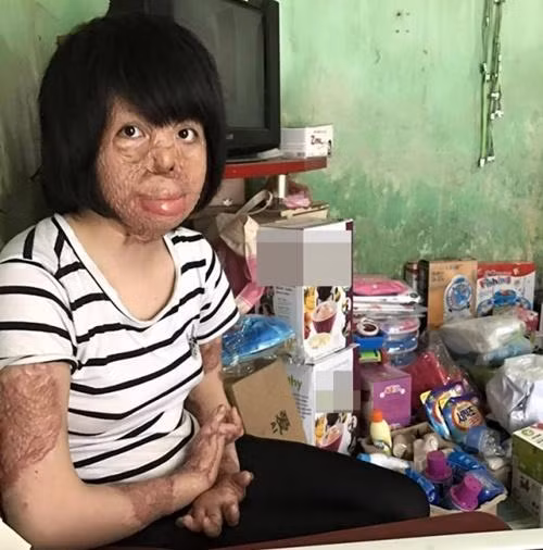 Từ cô gái có làn da mịn màng, trắng trẻo... giờ đây gương mặt Dung là những mảng sẹo lồi lõm, nhiều vùng da thỉnh thoảng bật máu. Mái tóc dài mượt mà ngày xưa giờ lởm chởm, khô cứng, được túm gọn dây chun đằng sau để Dung tiện sinh hoạt.