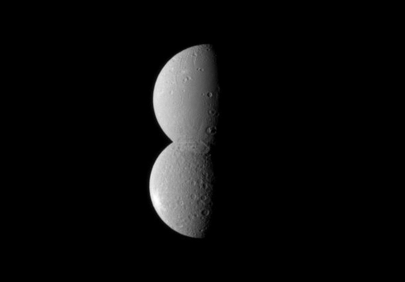 Trước khi kết thúc sứ mệnh, tàu thăm dò vũ trụ Cassini của NASA đã thực hiện được bức ảnh khác thường về hai vệ tinh Dione và Rhea của sao Thổ. Trên bức ảnh, hai vệ tinh này như kết dính với nhau, tạo hình “bù nhìn tuyết” hoặc 2 khối kem hình cầu chồng lên nhau. Bức ảnh được chụp nhờ phối cảnh thích hợp.