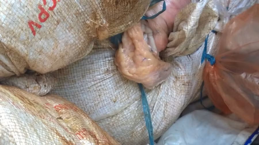 Qua kiểm tra, phát hiện trên xe chở 11 thùng nội tạng động vật có trọng lượng 715 kg, bảy thùng mỡ, da động vật có trọng lượng 420 kg và tám bao mỡ nặng 440 kg, tất cả đều đã bốc mùi hôi thối.