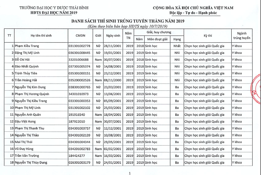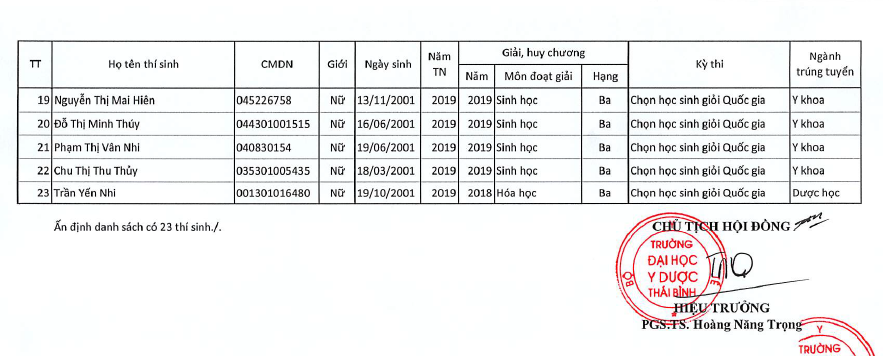 Đáng chú ý, 23 thí sinh này đều đoạt giải Nhất, Nhì, Ba Kỳ thi học sinh giỏi quốc gia, trong đó có 22 thí sinh đoạt giải môn Sinh học và 1 thí sinh đoạt giải môn Hóa học.